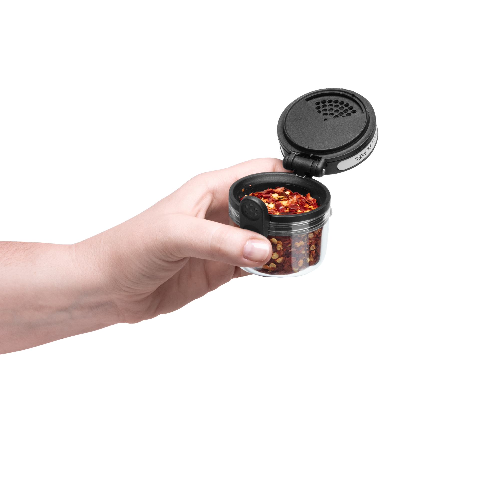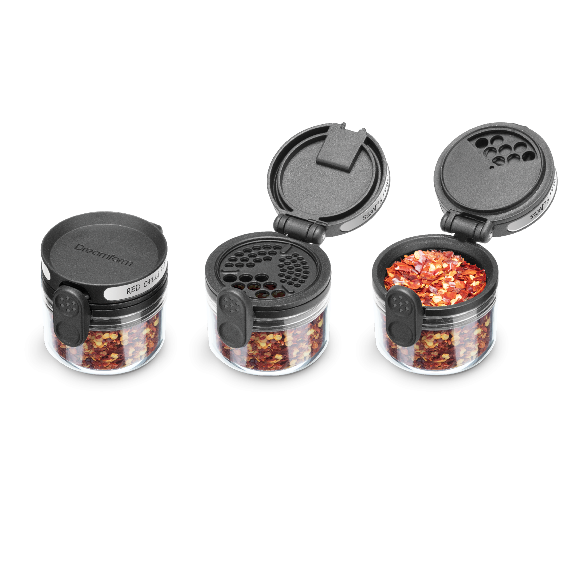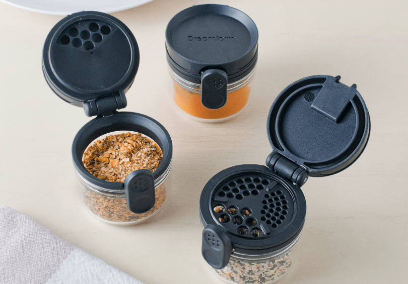 Ühe nupuvajutusega saad valida, kas avaneb raputusava (erinevate mõõtudega) või kogu purgisuu, võimaldades täitmist või lusikaga võtmist.